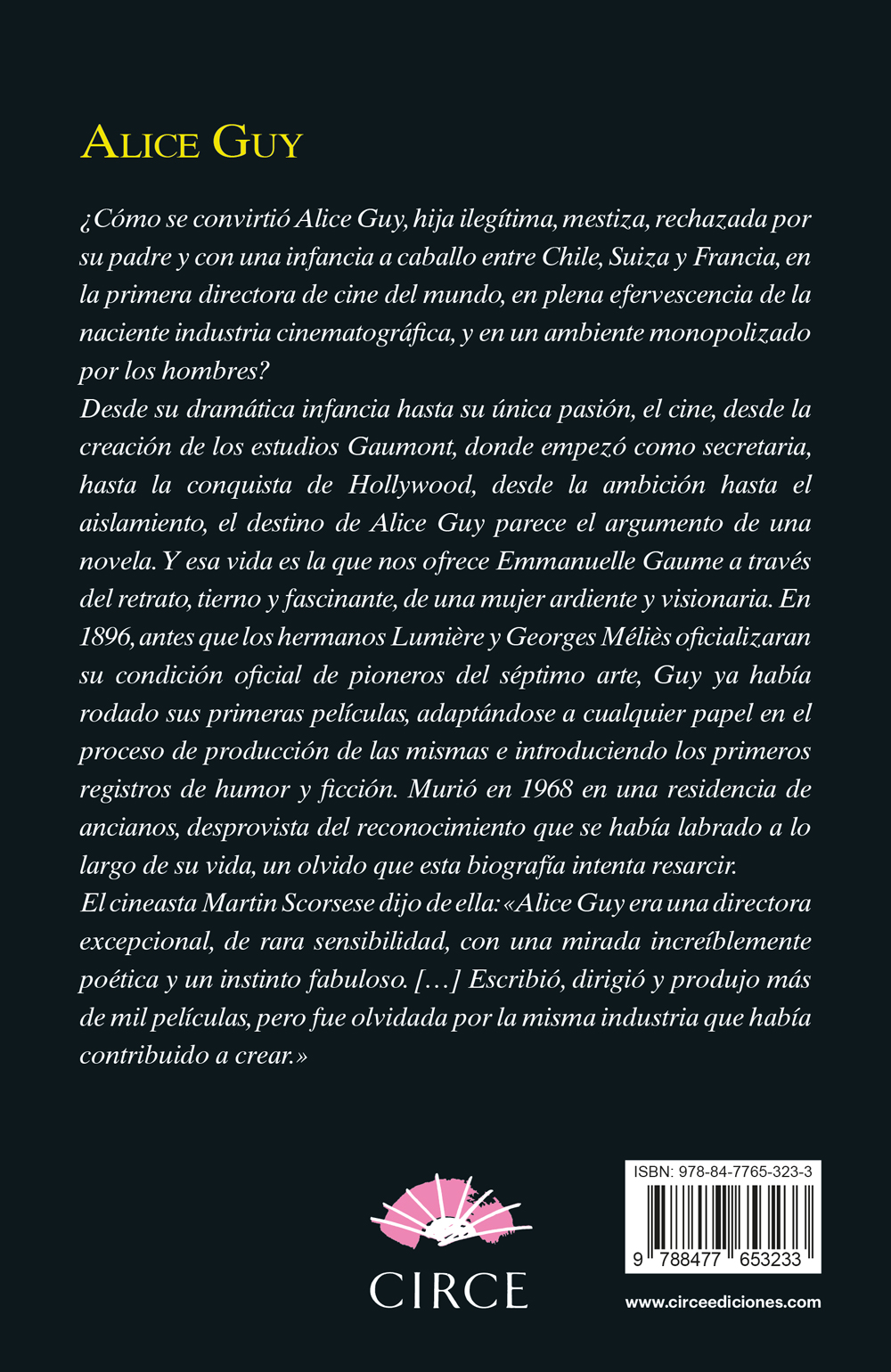 Desde su dramática infancia hasta su única pasión, el cine, desde la creación de los estudios Gaumont, donde empezó como secretaria, hasta la conquista de Hollywood, desde la ambición hasta el aislamiento, el destino de Alice Guy parece una novela. Y es esa vida la que nos ofrece Emmanuelle Gaume a través del retrato, tierno y fascinante, de una mujer ardiente y visionaria. En 1896, antes que los Hermanos Lumière y Méliès oficializaran su condición oficial de pioneros del Séptimo Arte, Guy ya había rodado sus primeras películas, adaptándose siempre a todos los papeles de la producción e introduciendo los primeros registros del humor y de la ficción. Murió en 1968 en un asilo de ancianos, desprovista del reconocimiento que se había labrado a lo largo de su vida, un olvido que esta biografía intenta resarcir.